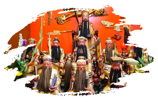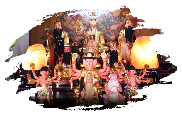 配奉神祇:三清道祖-太上老君 元始天尊 靈寶天尊 伏羲聖帝 軒轅黃帝 張道凌天師 神農大帝 文昌帝君 呂仙祖 斗姥元君 左輔 右弼